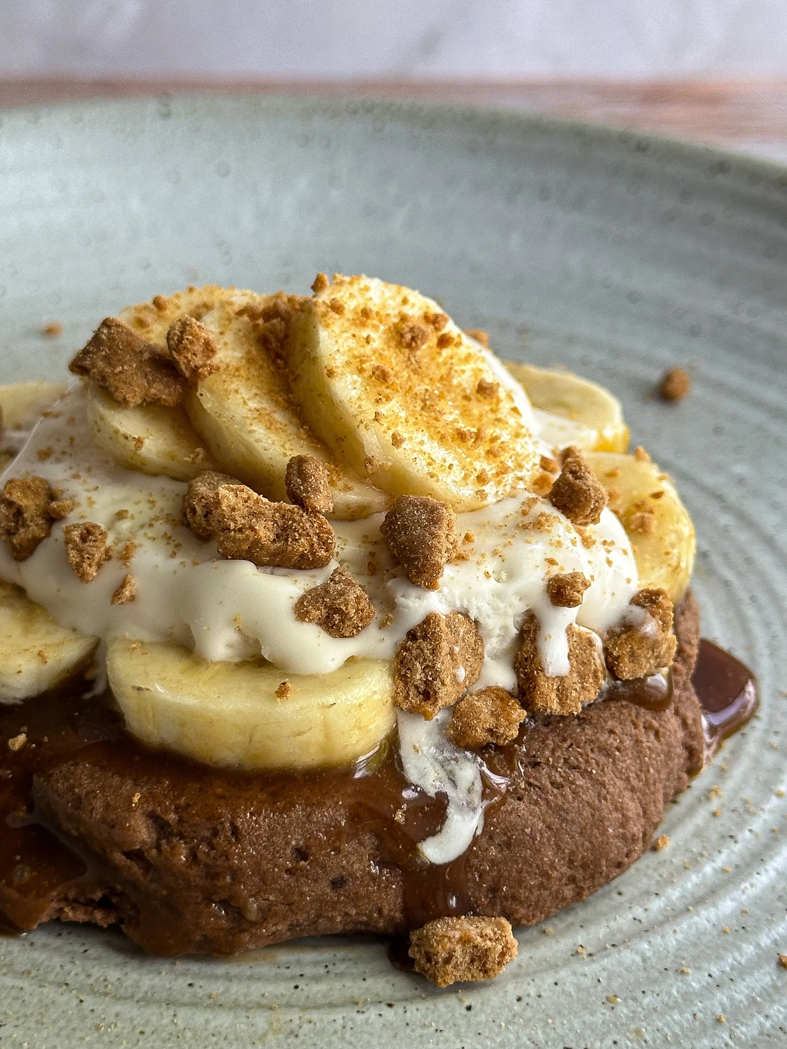 My take on the classic British dessert Banoffee Pie which gets its name from the ingredients used to make it: bananas and toffee! I turned it instead into a giant protein cookie, with an easy 3 ingredient dairy free caramel, whipped coconut cream, fresh banana slices and crushed graham crackers. It is a total mouthful in all the best ways.