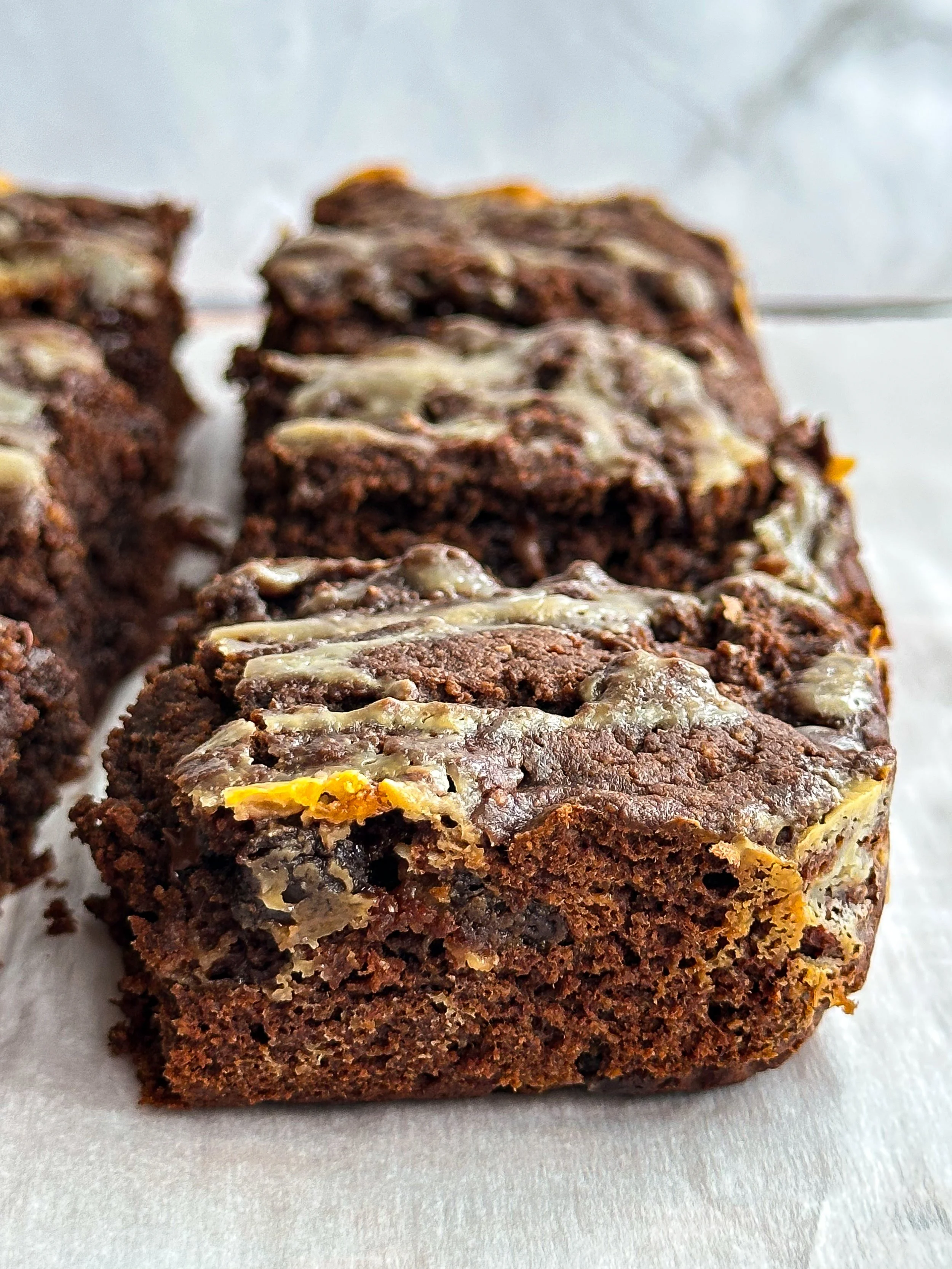 Not super dense like a traditional brownie, but not cakey either — kind of right in the middle. Soft, moist, and fudgy with a creamy swirl on top.