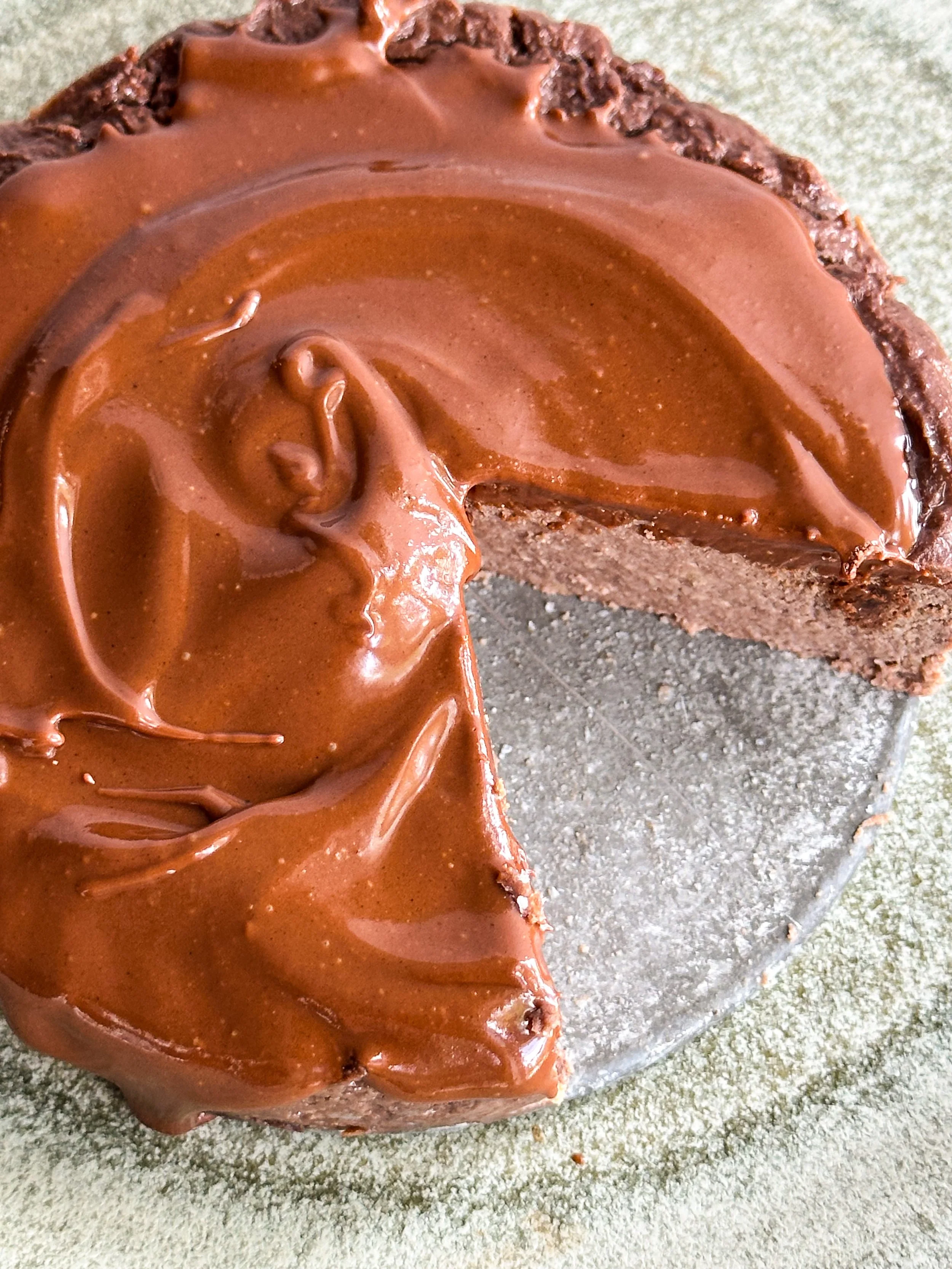 The base is a super creamy chocolate banana cheesecake made with just coconut yogurt, chocolate protein, and ripe banana. It’s dense like a mousse, but with a classic cheesecake like tang from the yogurt. And then there’s the ganache, OH MY GOSH the ganache…melted dark chocolate and creamy peanut butter swirled together on top, SWOON. It sets into this perfect melt in your mouth fudge layer that makes each and every bite even more decadent and rich.