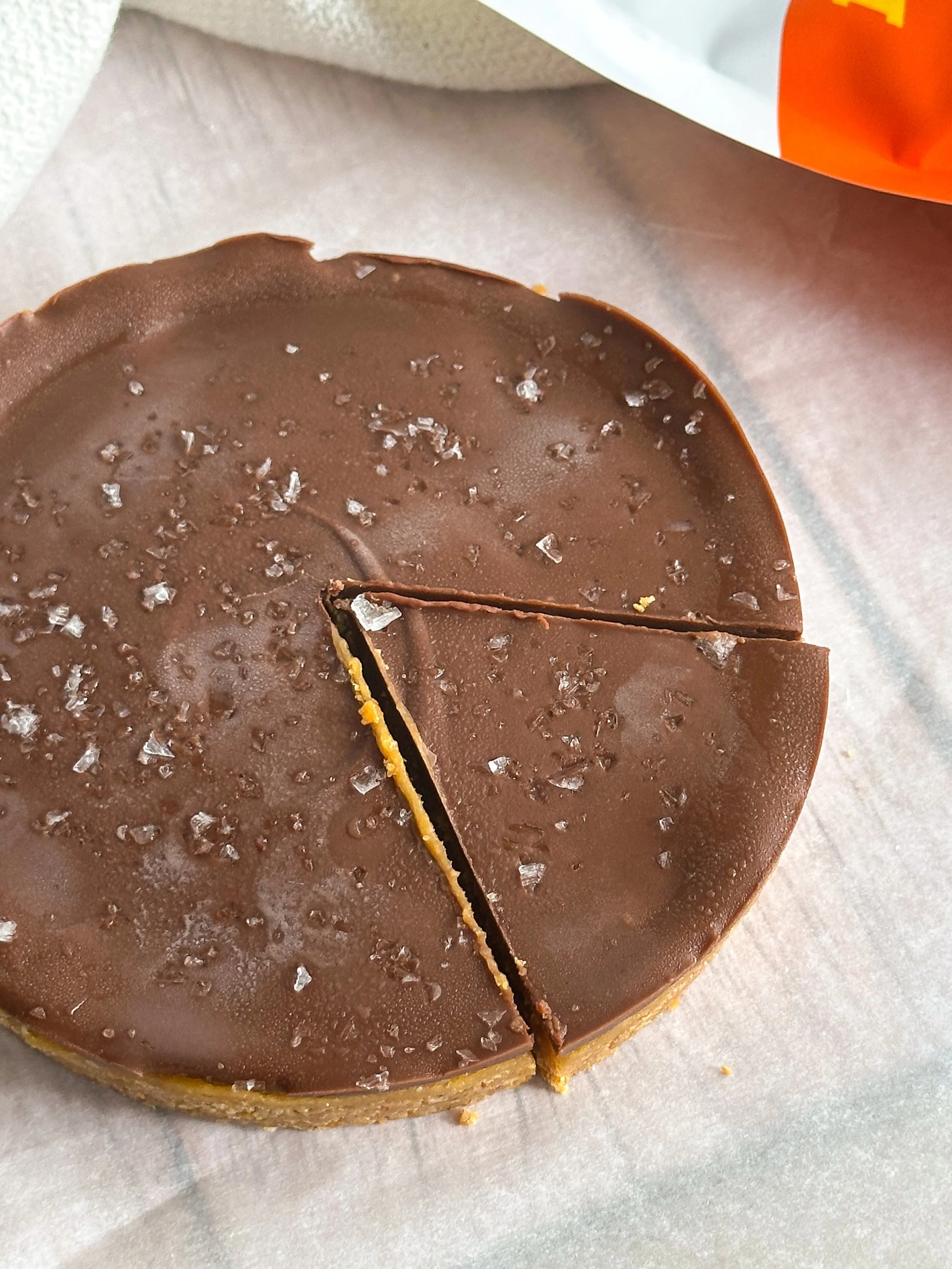 This giant peanut butter cup is every chocolate + peanut butter lover’s dream. With a crunchy granola base, creamy peanut butter caramel, and a rich chocolate topping.