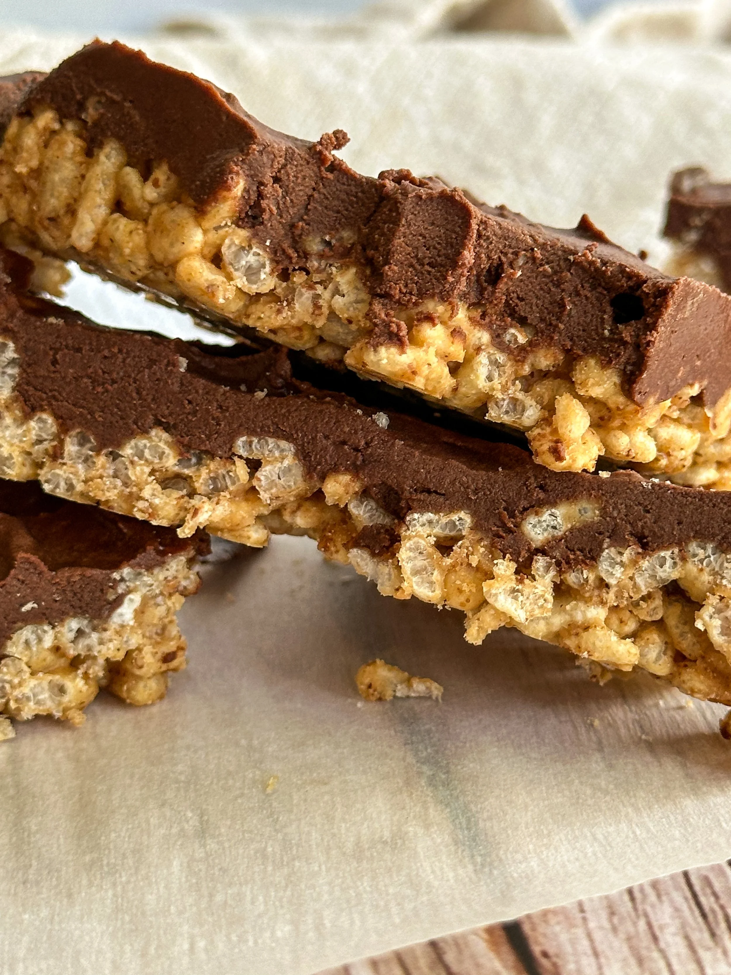 You only need a few pantry staples to make them: crispy rice cereal, coconut butter, almond butter, maple syrup, and cocoa powder. The fudge layer sets beautifully in the freezer and melts in your mouth when you take a bite. They’re indulgent, but still made with ingredients that leave you feeling good.
