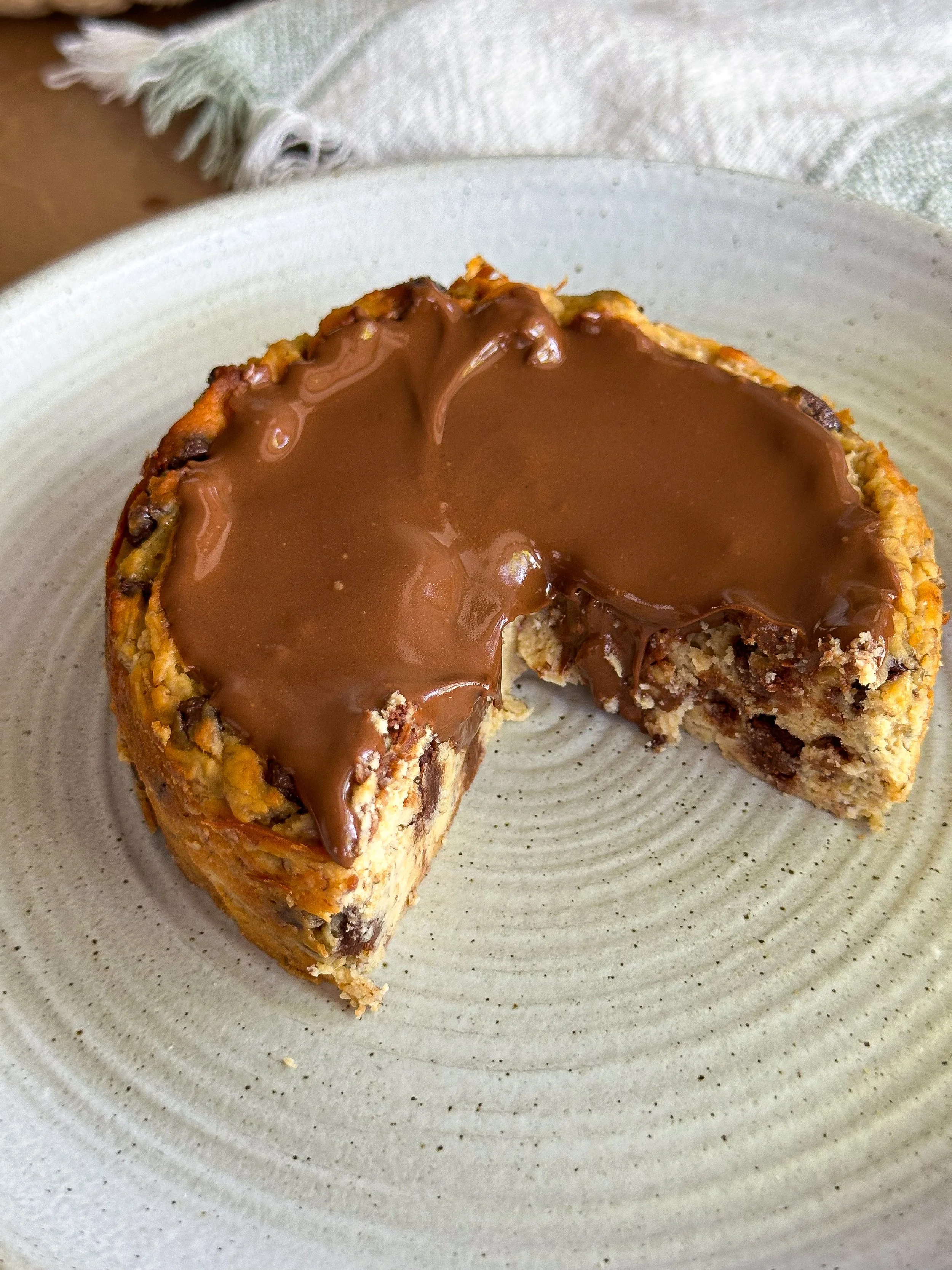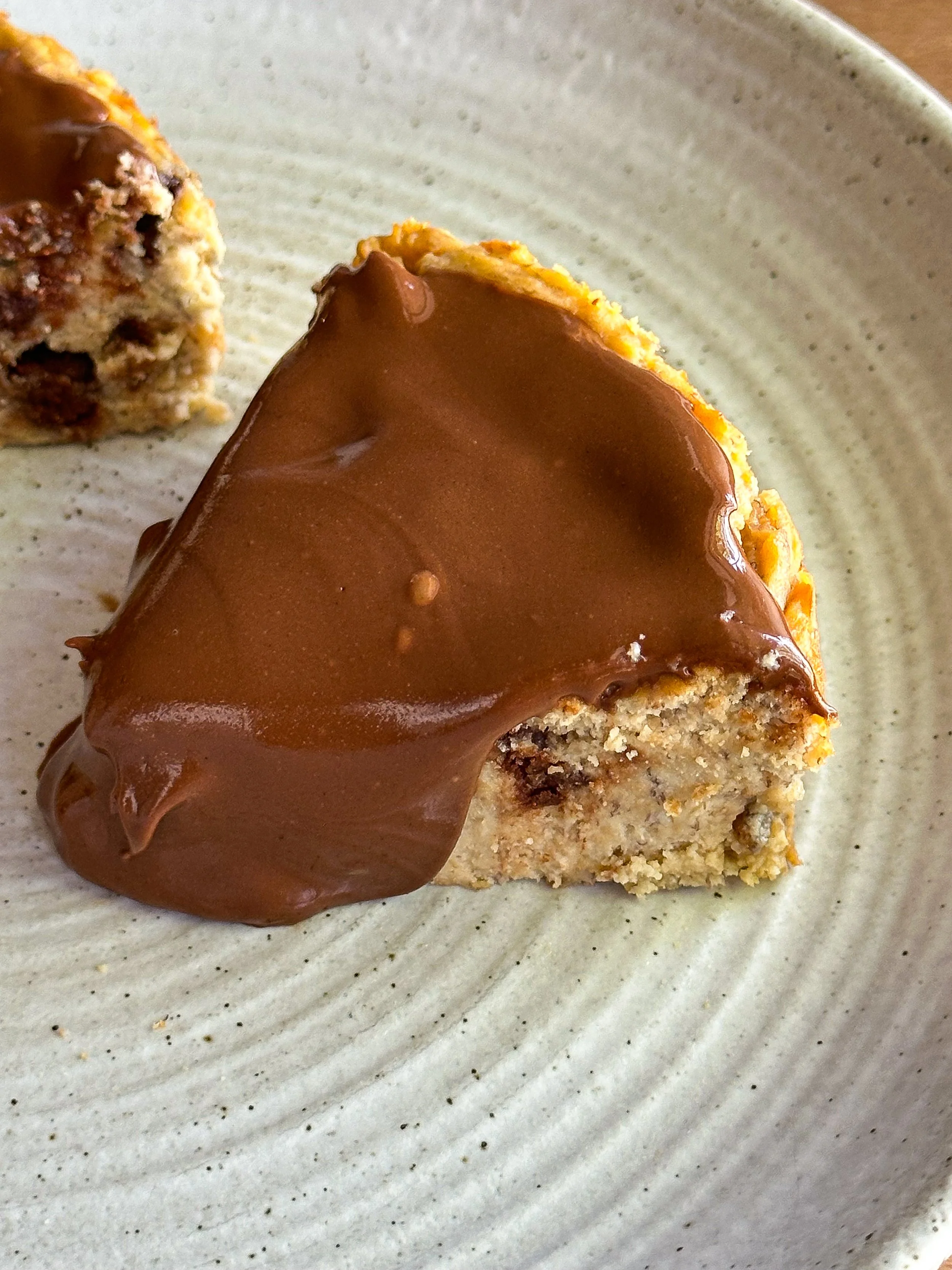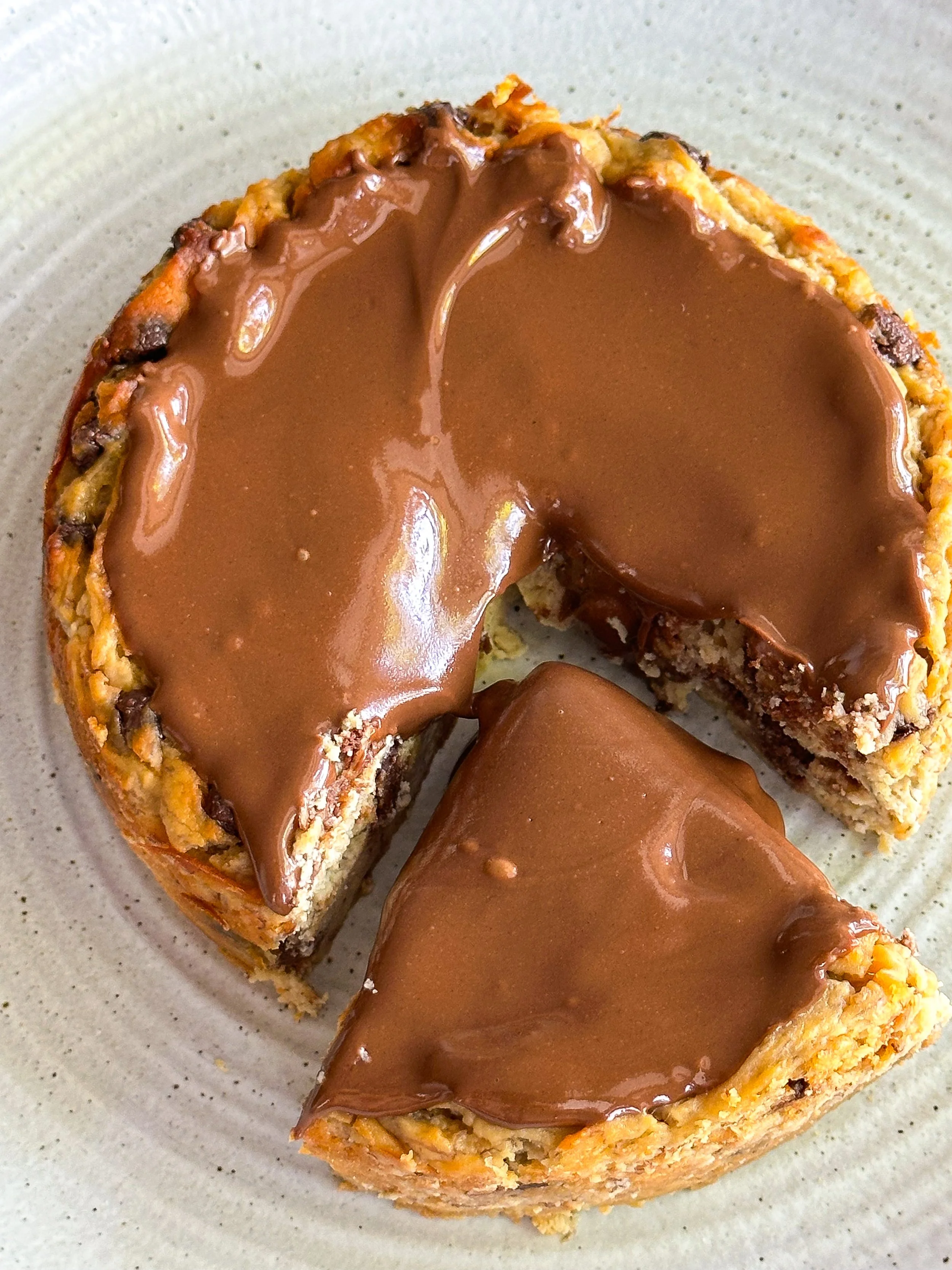 A thick, fluffy banana cheesecake studded with chocolate chips and covered in a creamy, dreamy peanut butter ganache. completely sugar-free—just sweetened with banana (use date-sweetened or keto chocolate chips if you like). it tastes super lush—but its healthy enough to have for breakfast because it’s lower in sugar, high in fiber, and seriously satiating, blood sugar balancing, and has 15 grams of protein per slice (depending on the protein powder you use, more tips on that later).