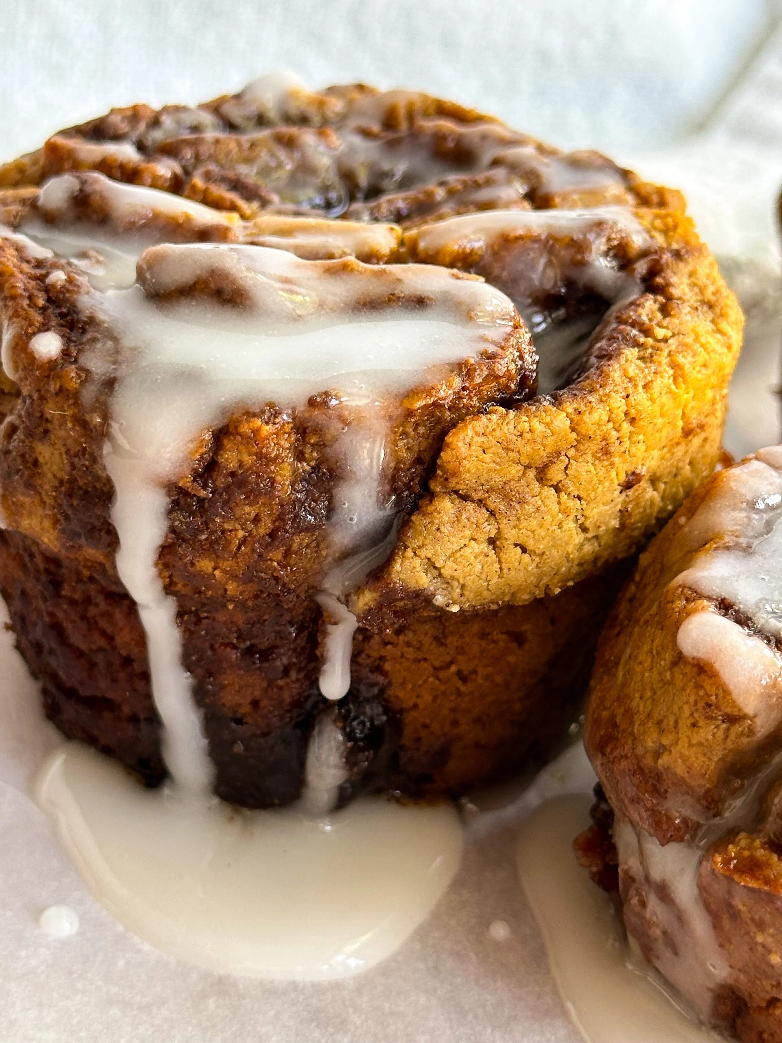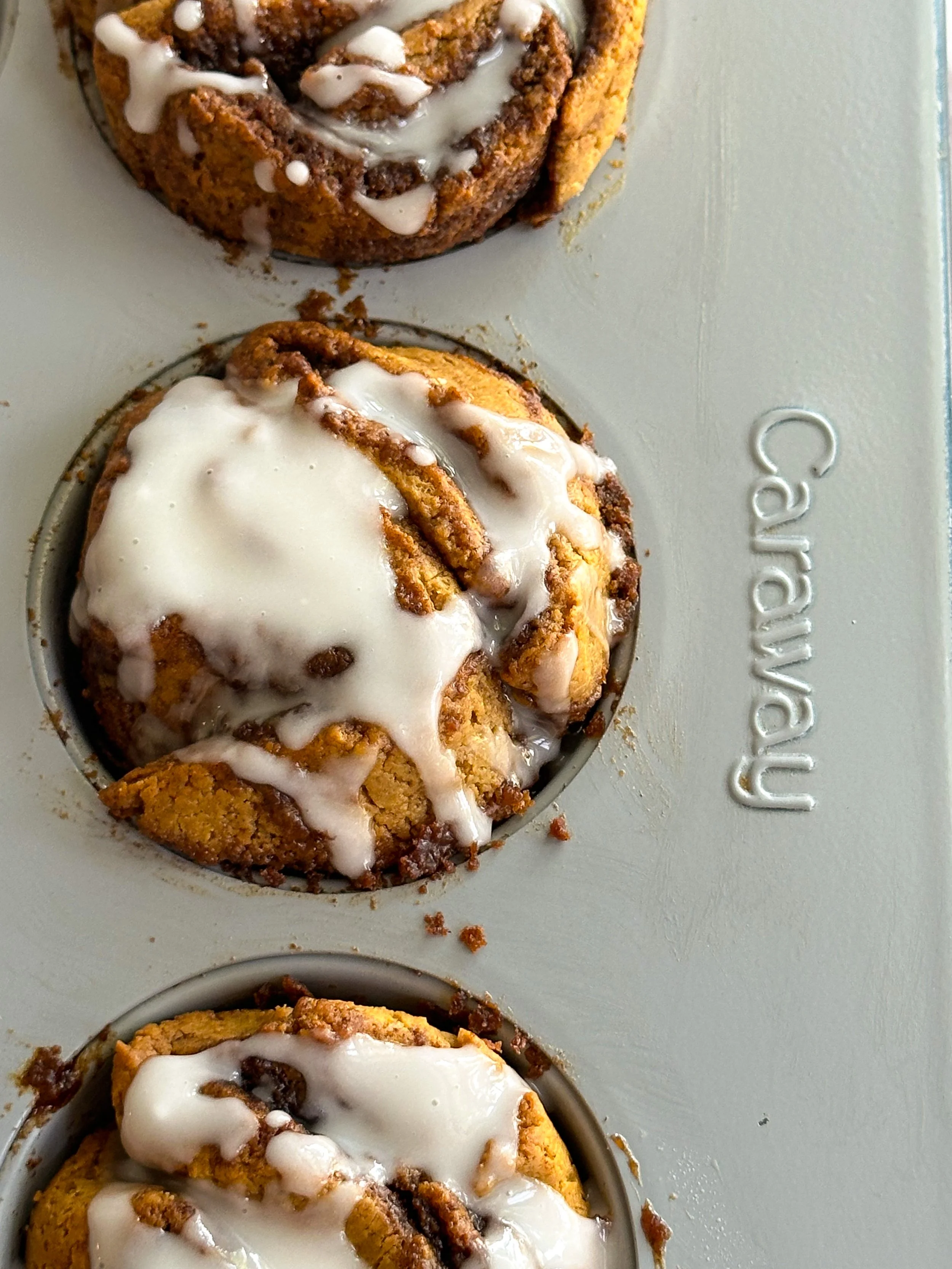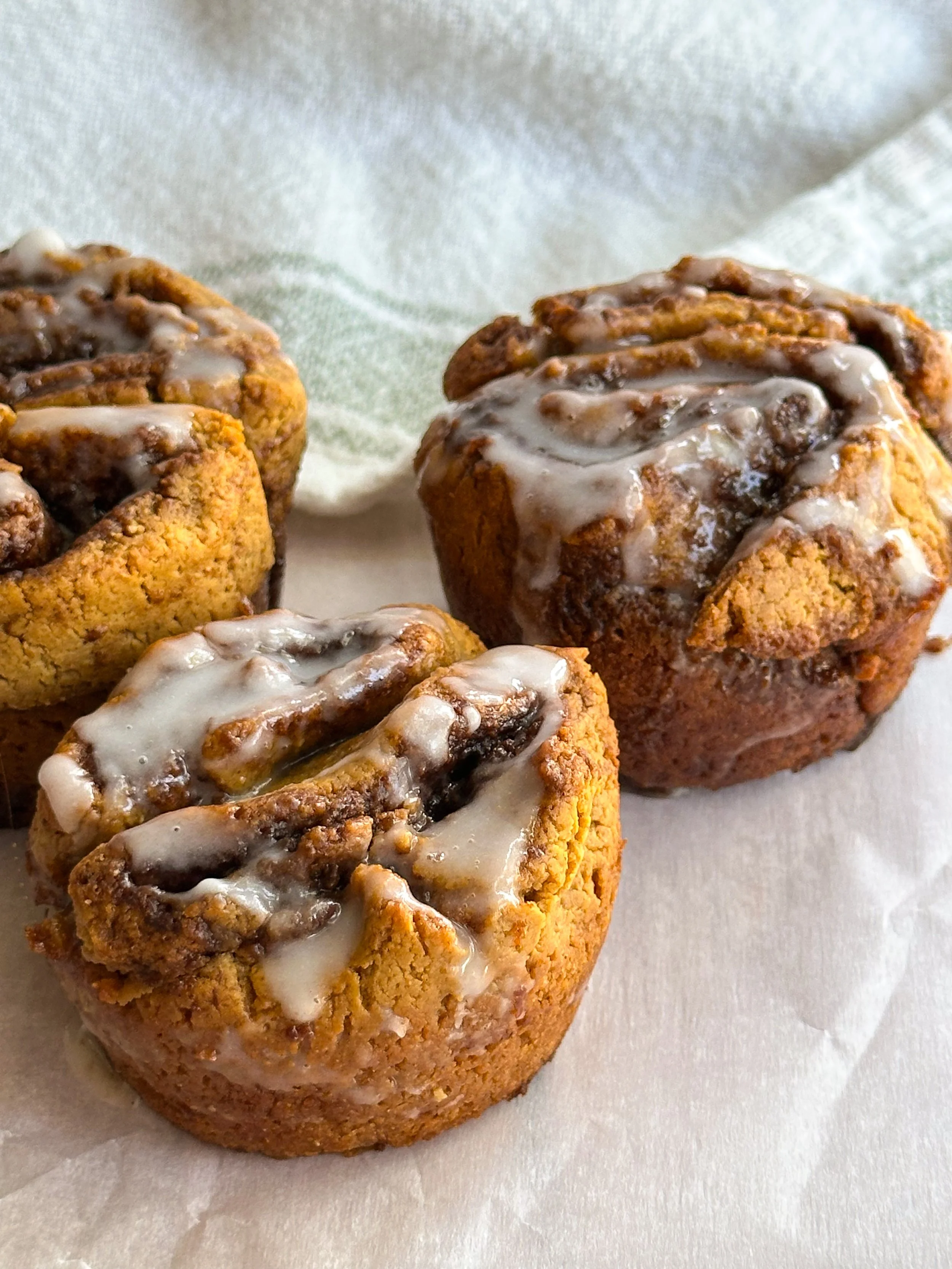 These Peanut Caramel Protein Cinnamon Roll Muffins are part of my steady descent into all things fall recipes. They combine everything you love about a classic cinnamon roll with a muffin tin twist. They’re soft, naturally sweetened, filled with a gooey peanut caramel, and topped with a simple sugar free glaze. They are made with wholesome ingredients, are gluten-free, refined sugar free, and have a solid boost of protein thanks to my all time favorite plant based protein powder.