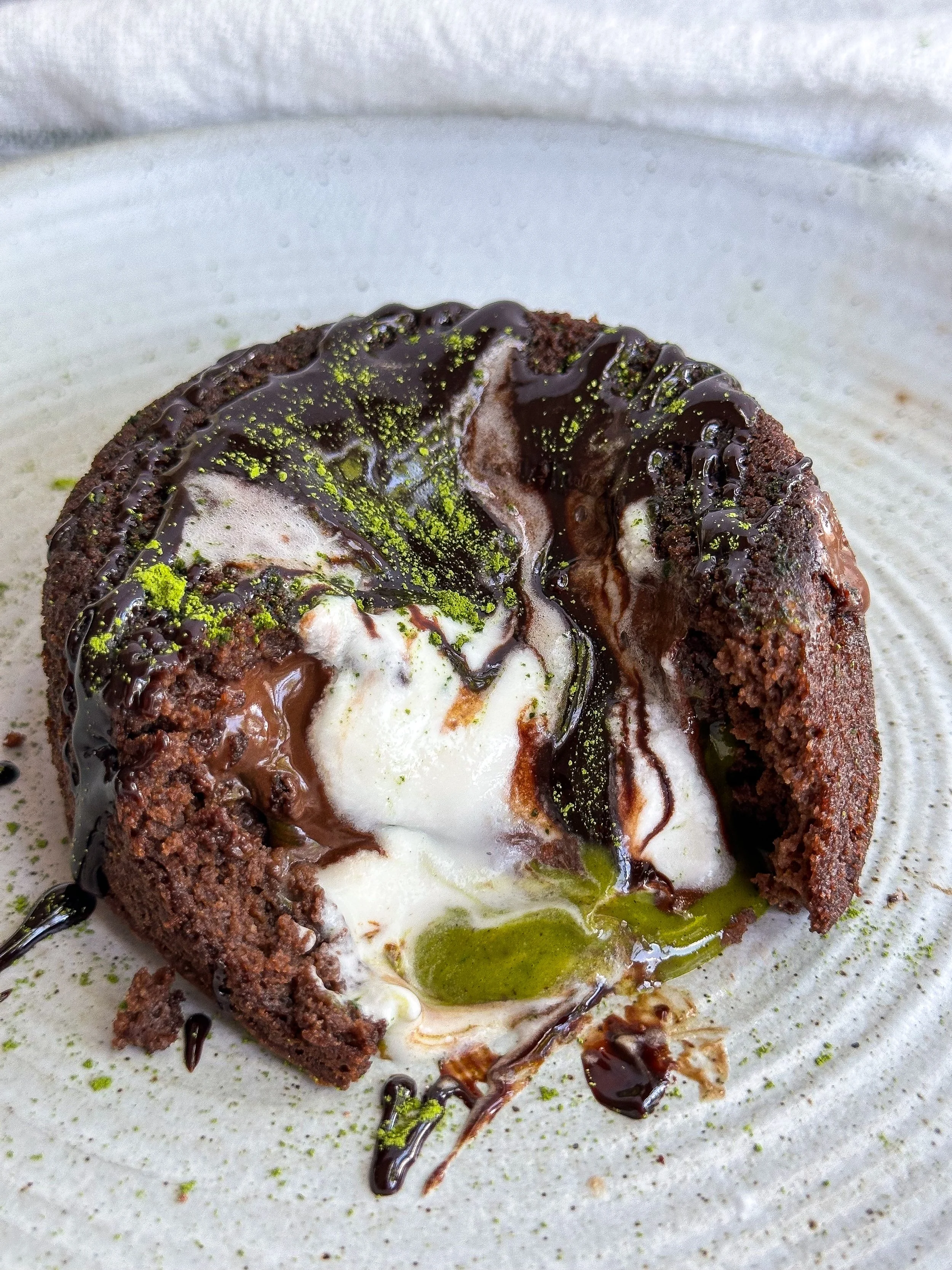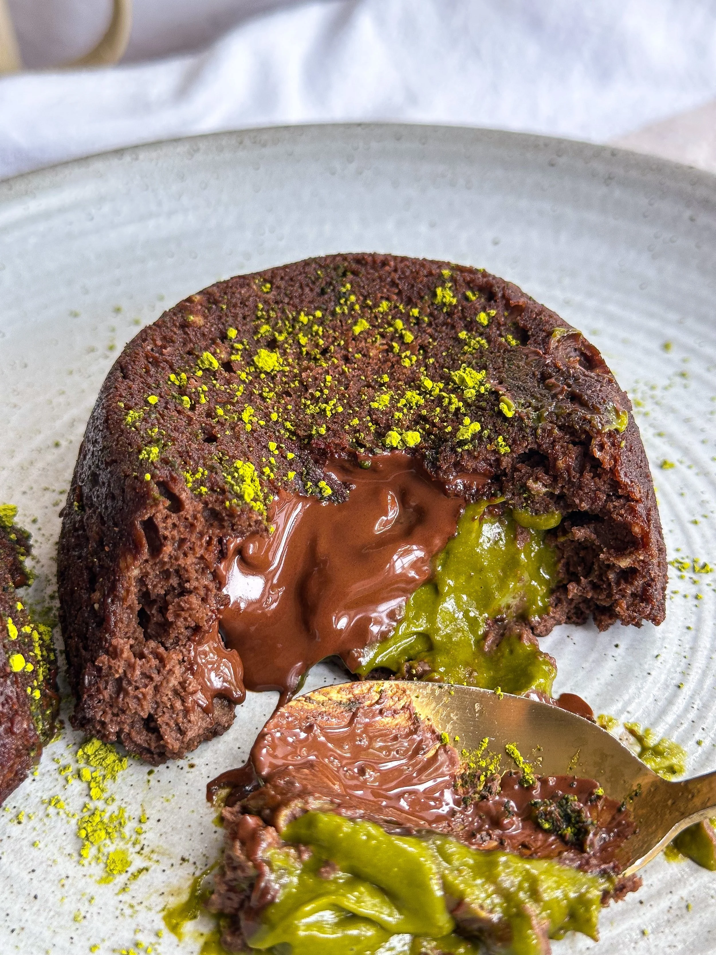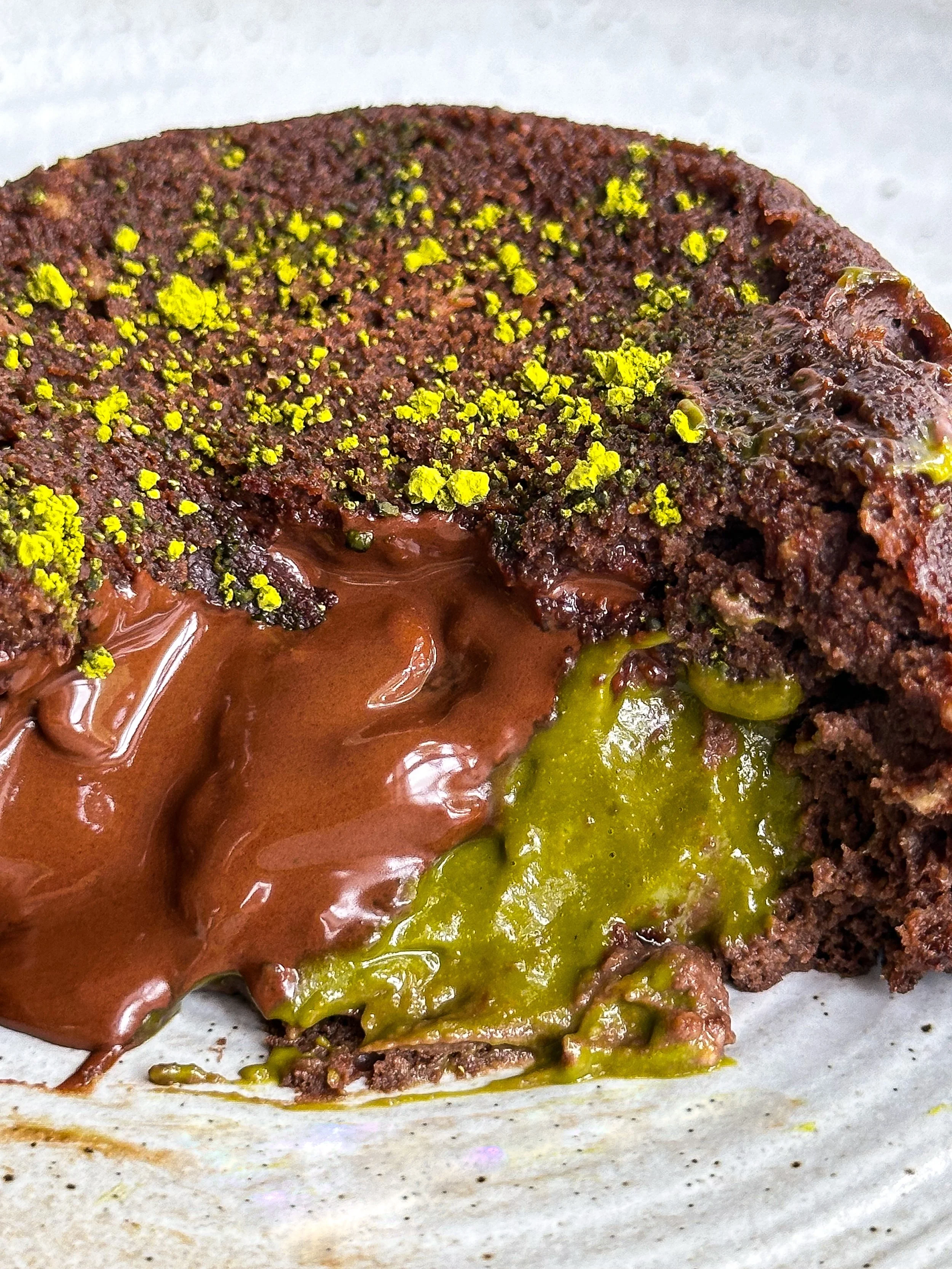 This one was a happy accident. I had pistachio butter in the fridge and a chocolate cake craving…and i wanted it NOW and i wanted it ‘now’ fast, and it just came together. It’s a single-serve lava cake with a soft, cakey exterior and a molten pistachio-chocolate center that melts as you dig in. The flavor is rich, not too sweet, and perfectly balanced with a little matcha in the filling to mellow out the richness.