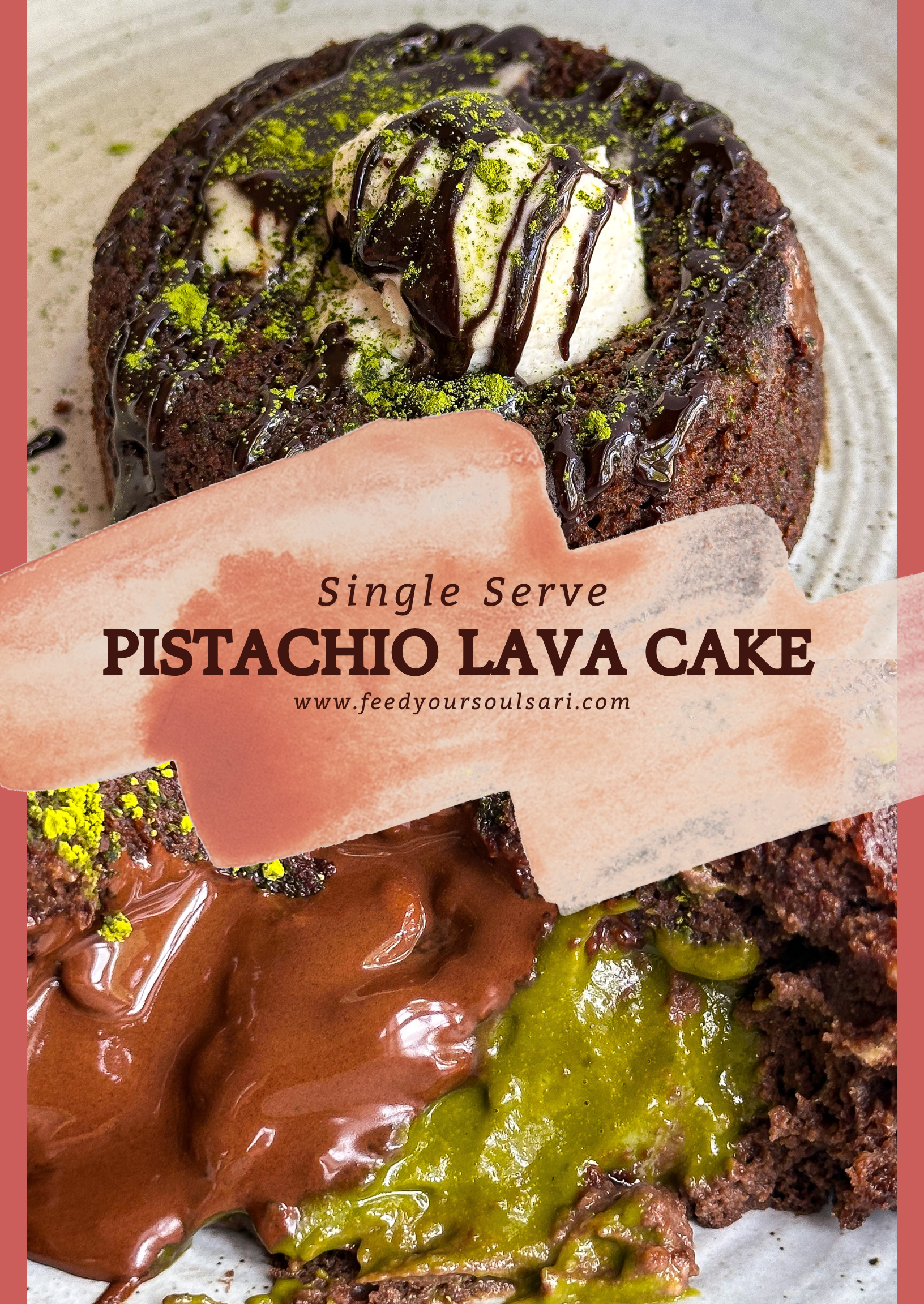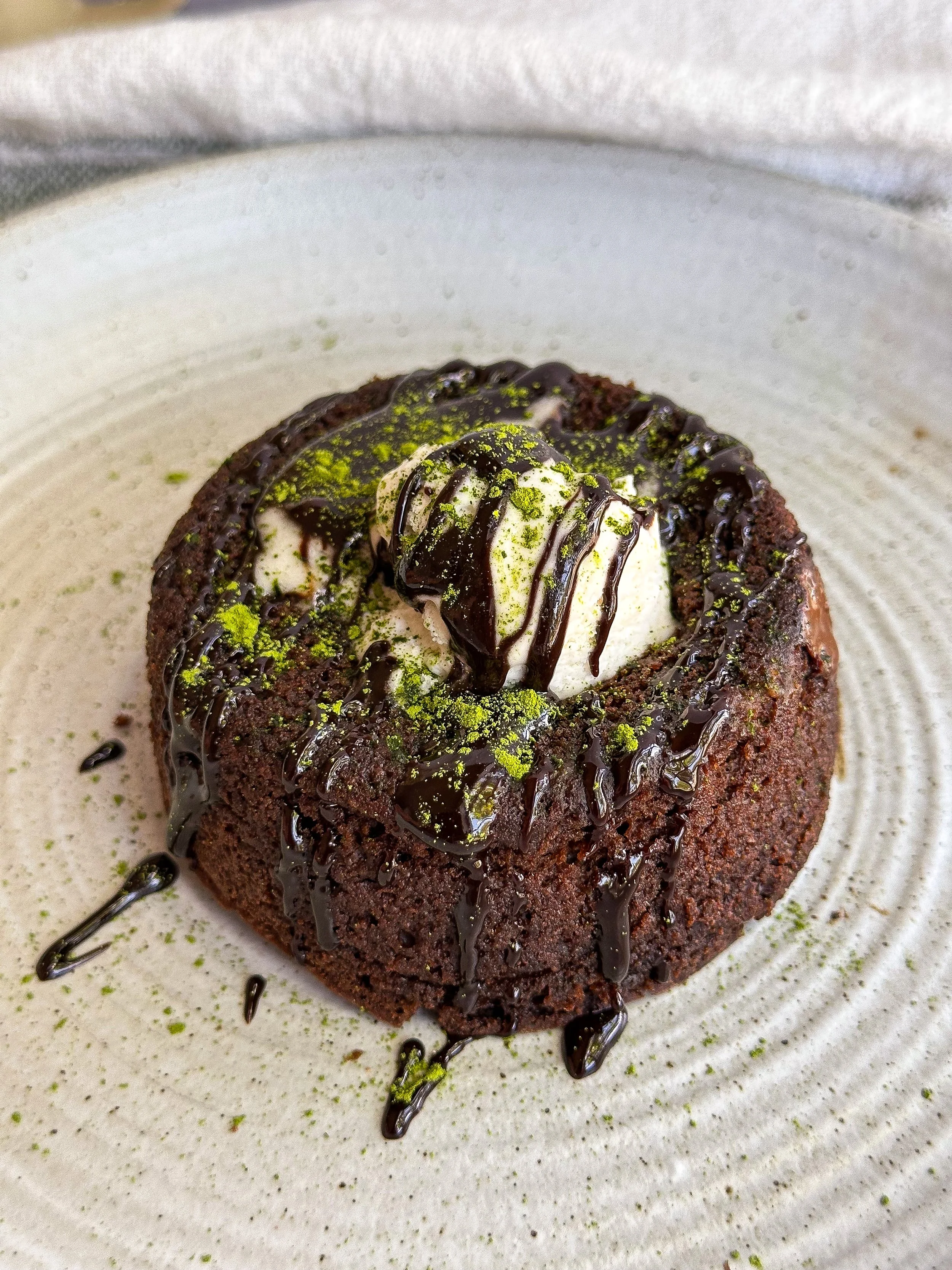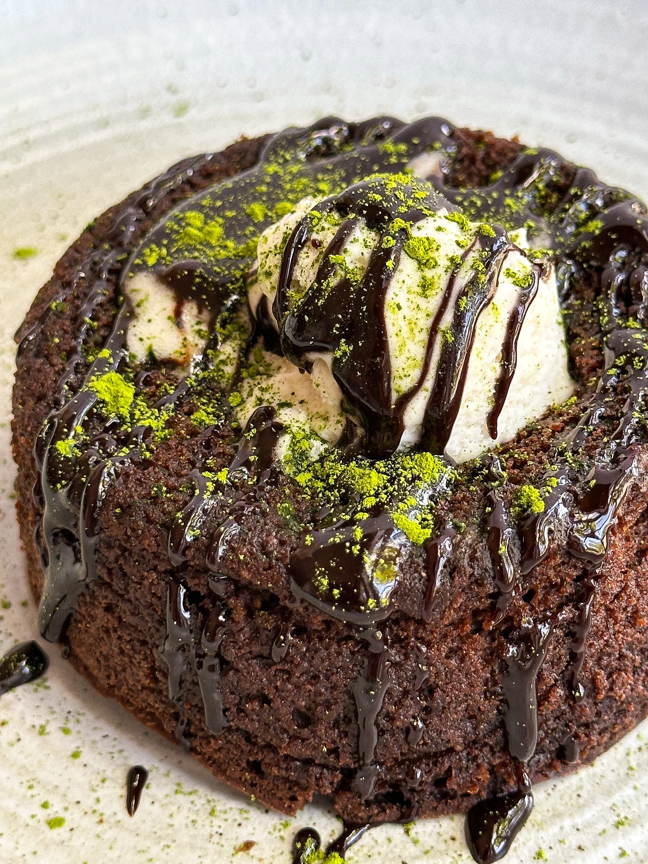 This one was a happy accident. I had pistachio butter in the fridge and a chocolate cake craving…and i wanted it NOW and i wanted it ‘now’ fast, and it just came together. It’s a single-serve lava cake with a soft, cakey exterior and a molten pistachio-chocolate center that melts as you dig in. The flavor is rich, not too sweet, and perfectly balanced with a little matcha in the filling to mellow out the richness.