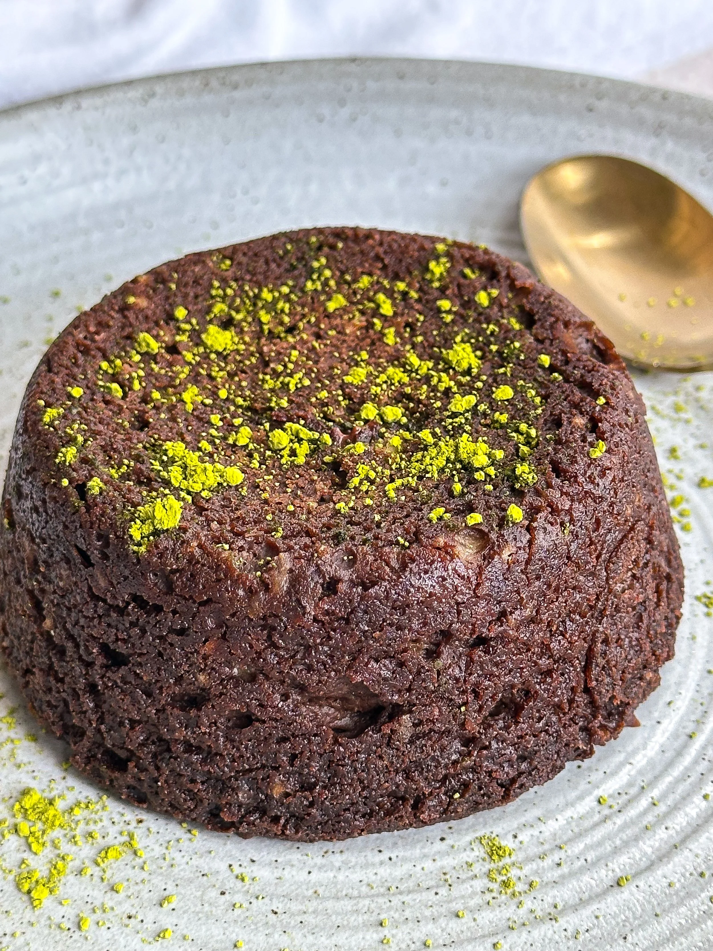 Pistachio butter brings this creamy, slightly nutty richness that pairs beautifully with the chocolate. The raw cacao gives the cake that deep, bold chocolate flavor without being overly sweet or bitter. The matcha adds a gentle, earthy brightness with a subtle grassy note that contrasts nicely with the richness and brings all of the chocolate and pistachio flavors together into one perfect little cake.
