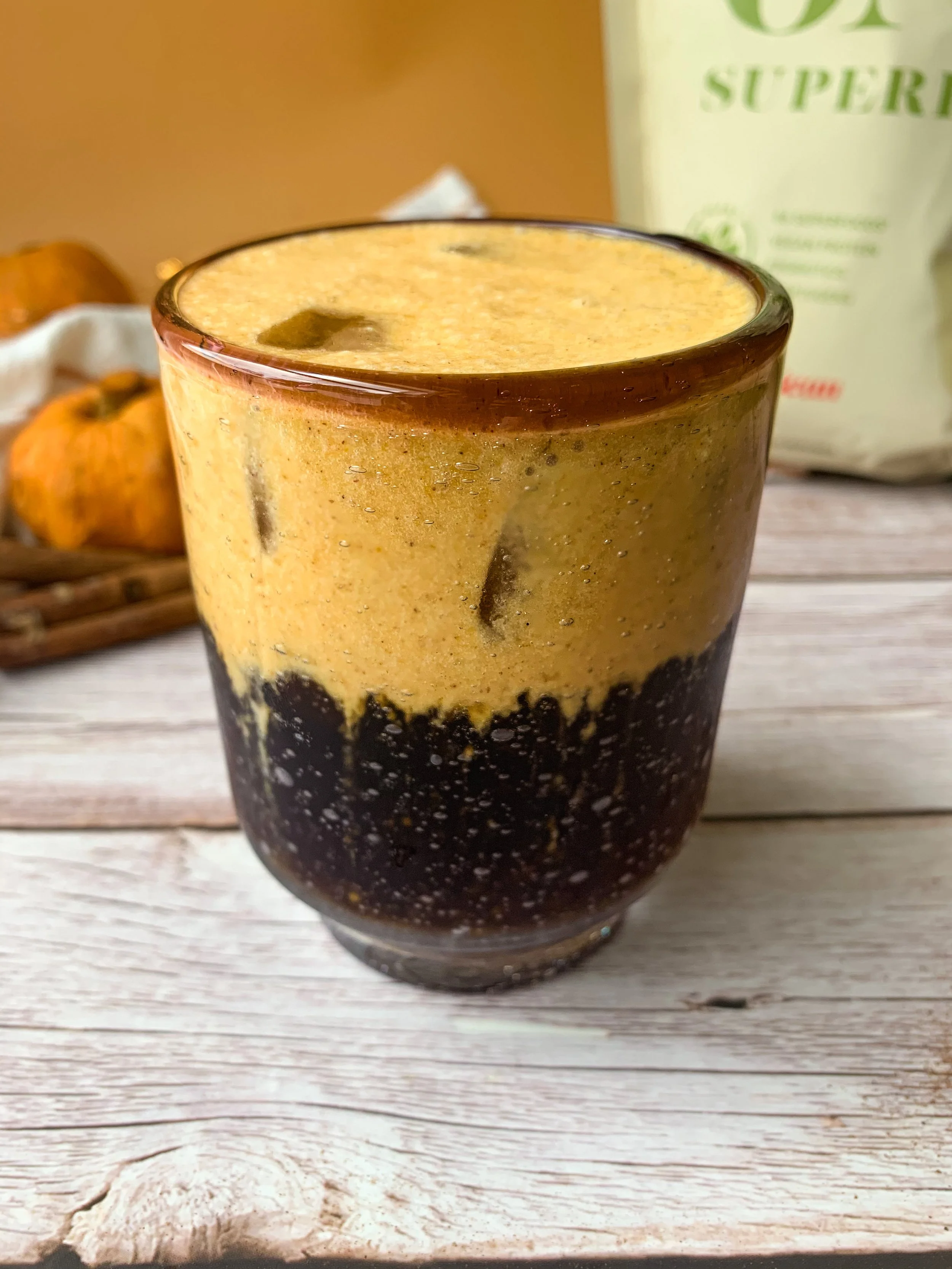 Bold cold brew topped with pumpkin spice protein cold foam. Dairy-free, naturally sweetened, and better than the coffee shop version.