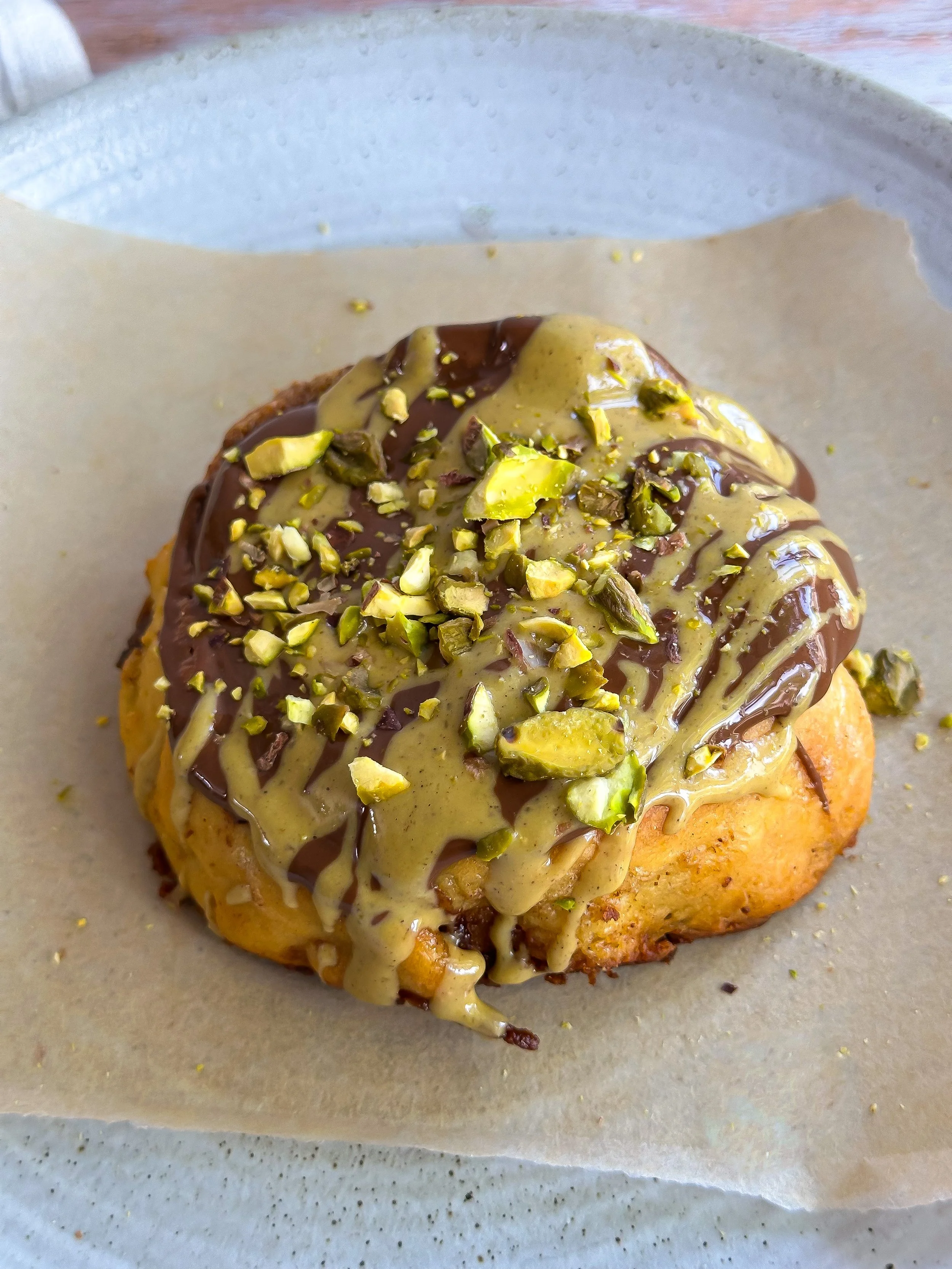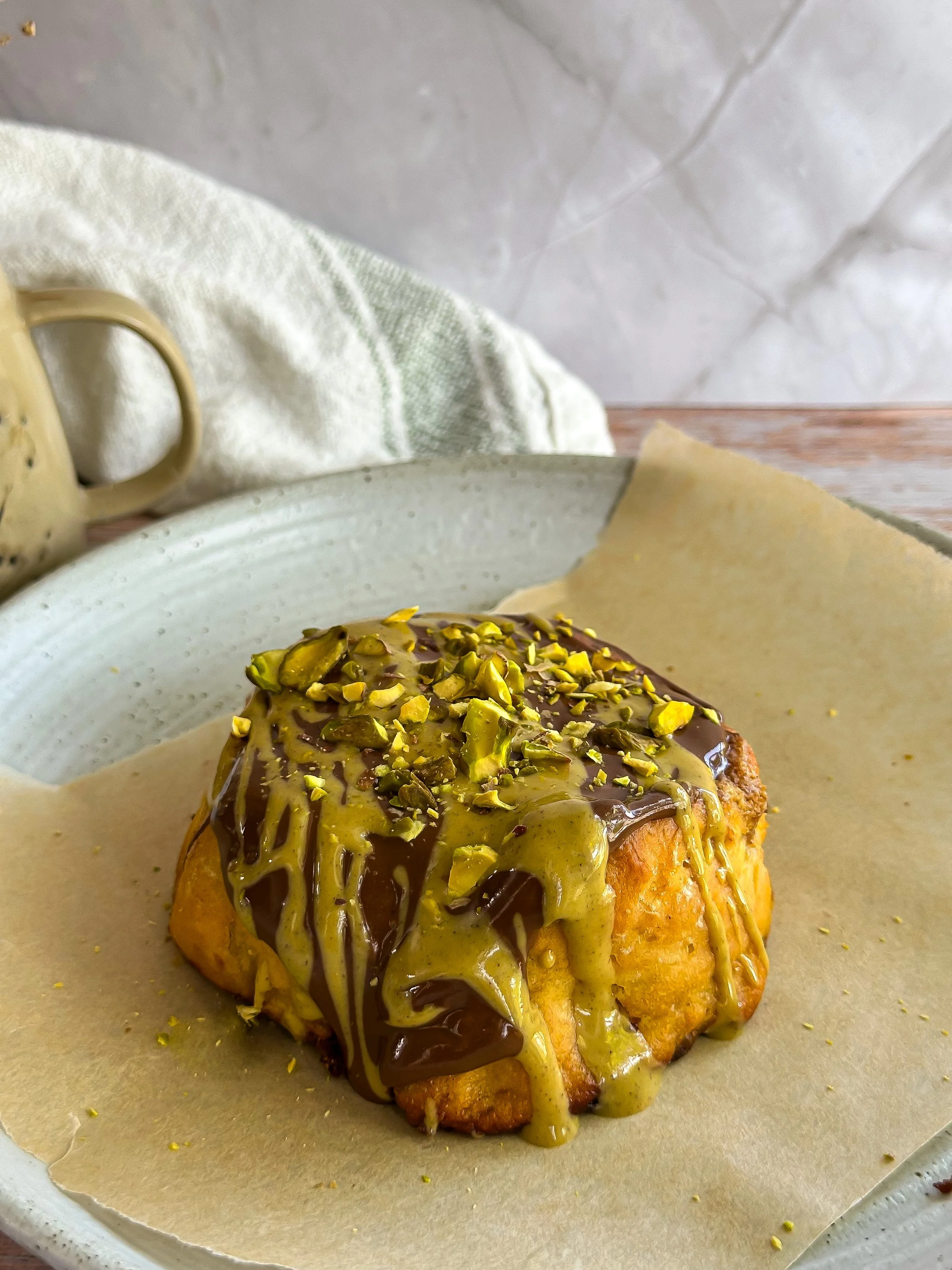 Once baked, pour the ganache over the warm roll. Drizzle with extra pistachio butter and a sprinkle of chopped pistachios if you’re feeling extra.