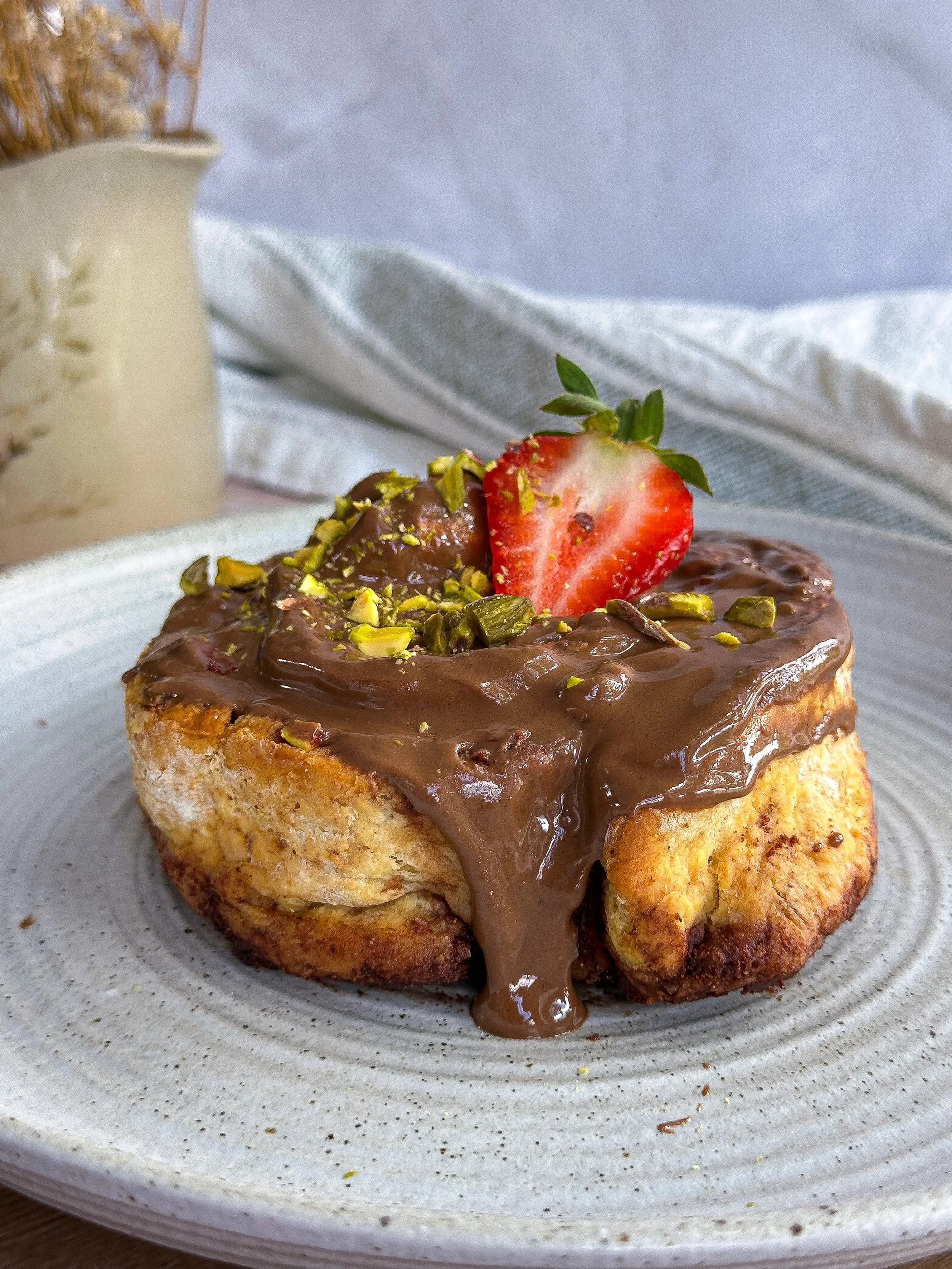 A single-serve, yeast-free banana bread roll filled with a rich date-sweetened chocolate pistachio filling, fresh strawberries, and crunchy pistachios, topped with a silky chocolate pistachio ganache. Perfectly balanced, nutrient-packed, and easy to make—your new go-to treat for when you want bakery vibes without the fuss or extra servings.