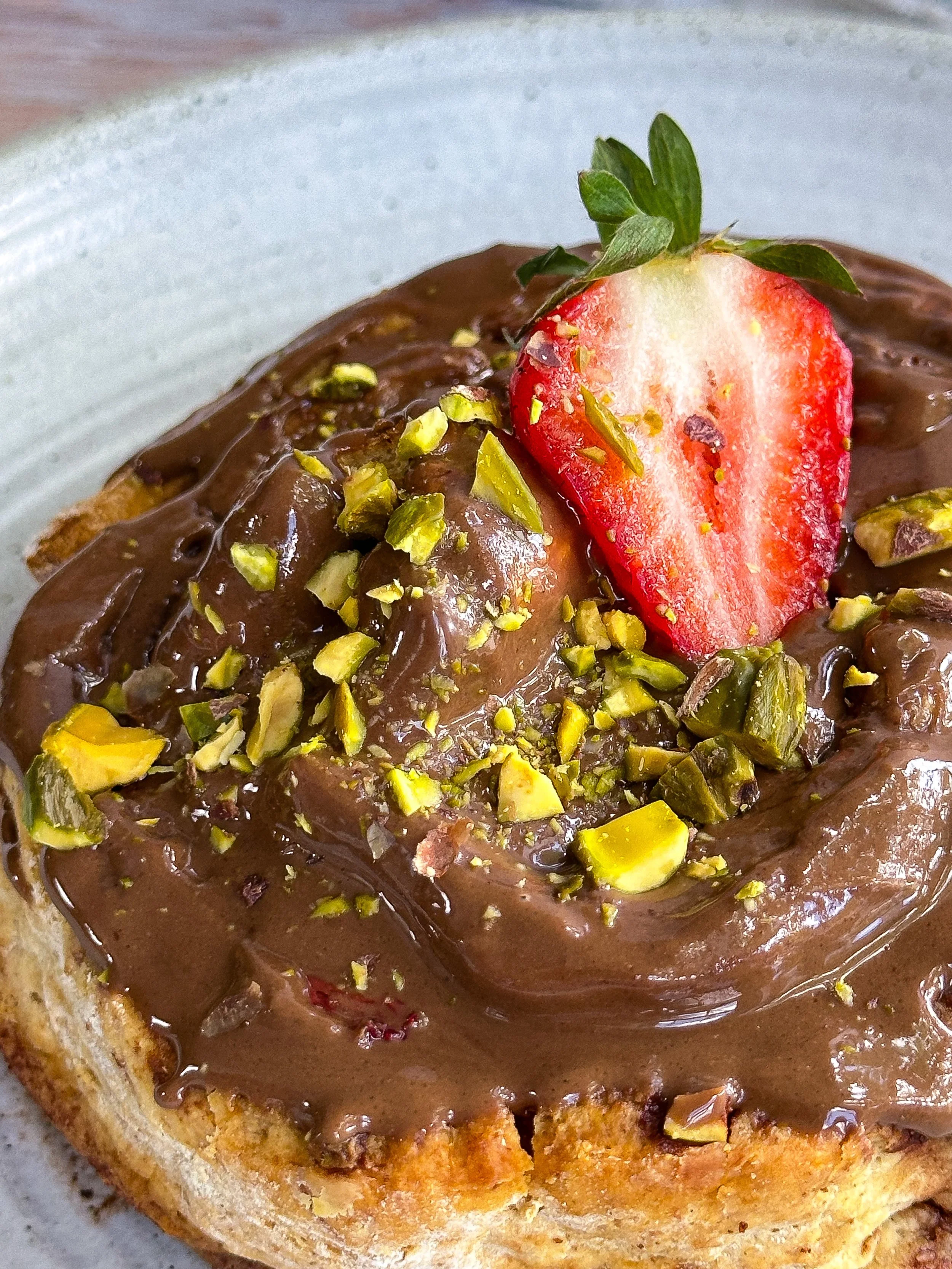 Add a homemade latte and one of these chocolate-stuffed rolls and I’m basically set for life… or at least until my next meal. But truly, this is the whole package, fluffy and gooey from the chocolatey filling, layered with textures and flavors throughout, and a silky-smooth pistachio ganache to top everything off.