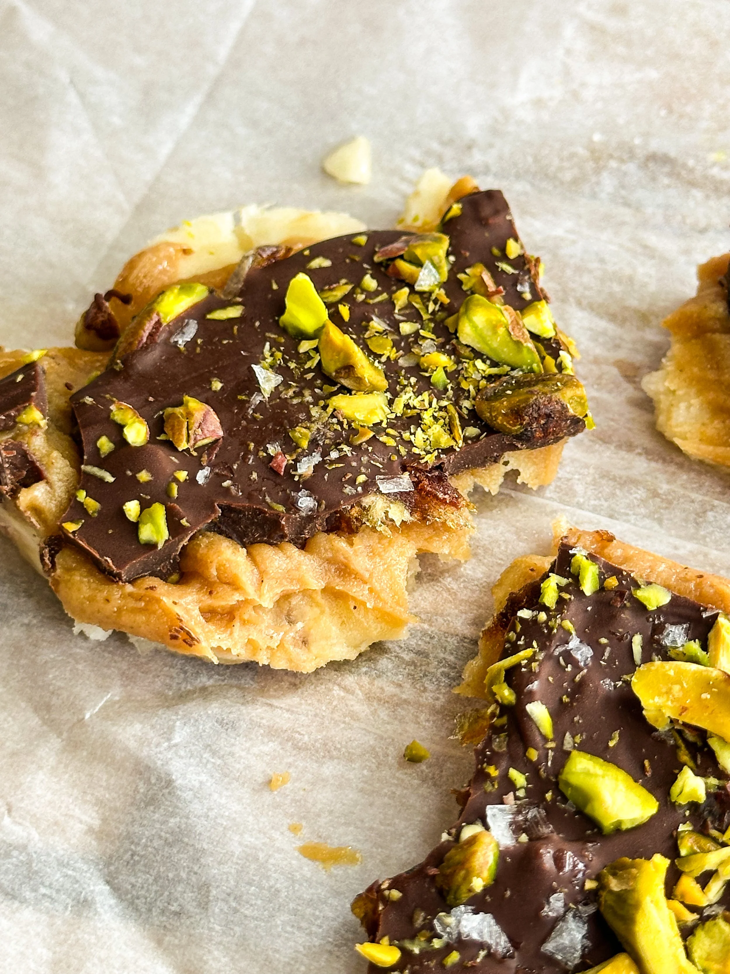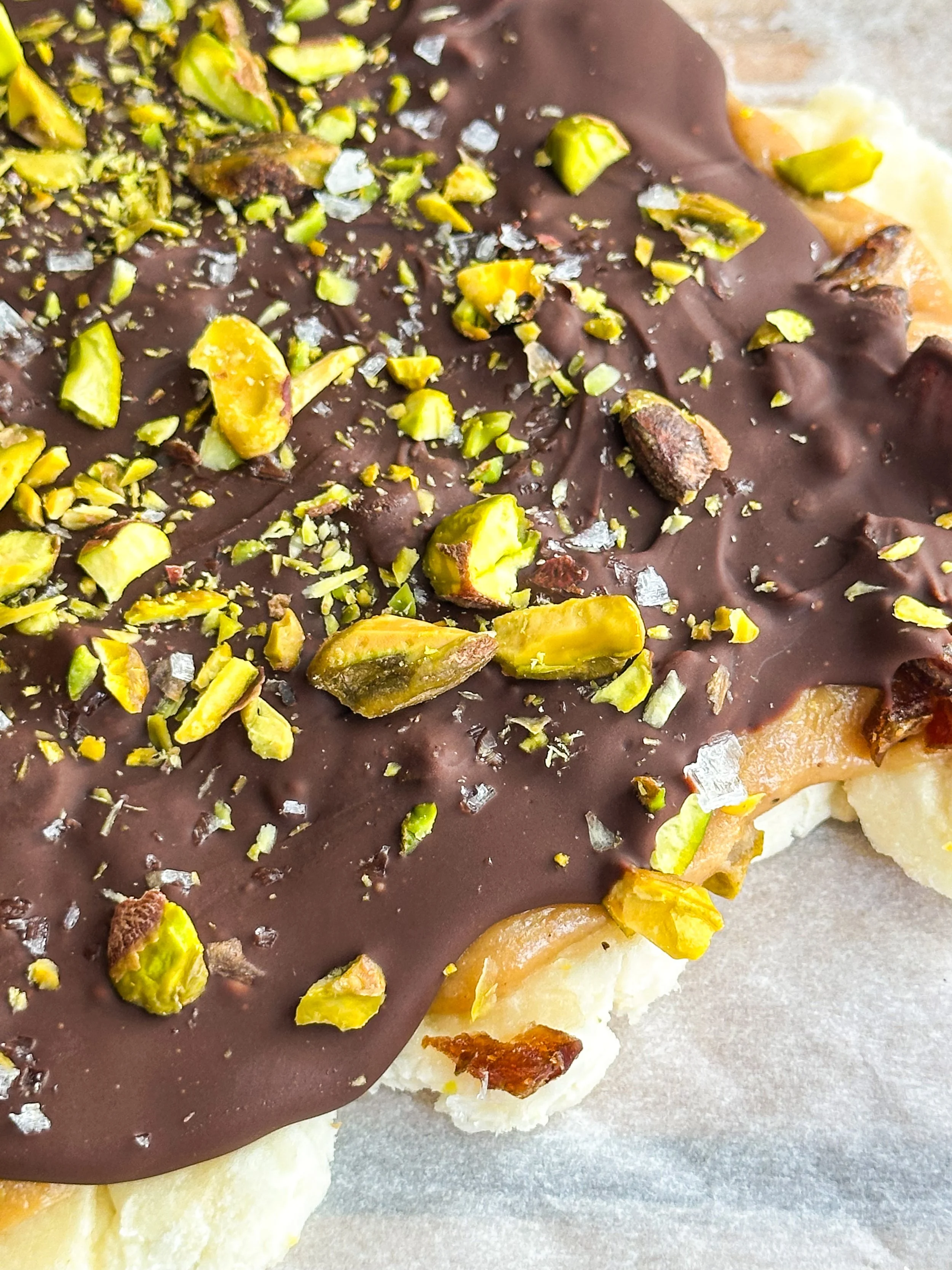 It hits all the textures — sticky tahini layer, chewy dates, crunchy pistachios, creamy frozen banana, and snappy dark chocolate shell on top. And it’s made with gut-friendly ingredients that leave you feeling good (no sugar crash here).