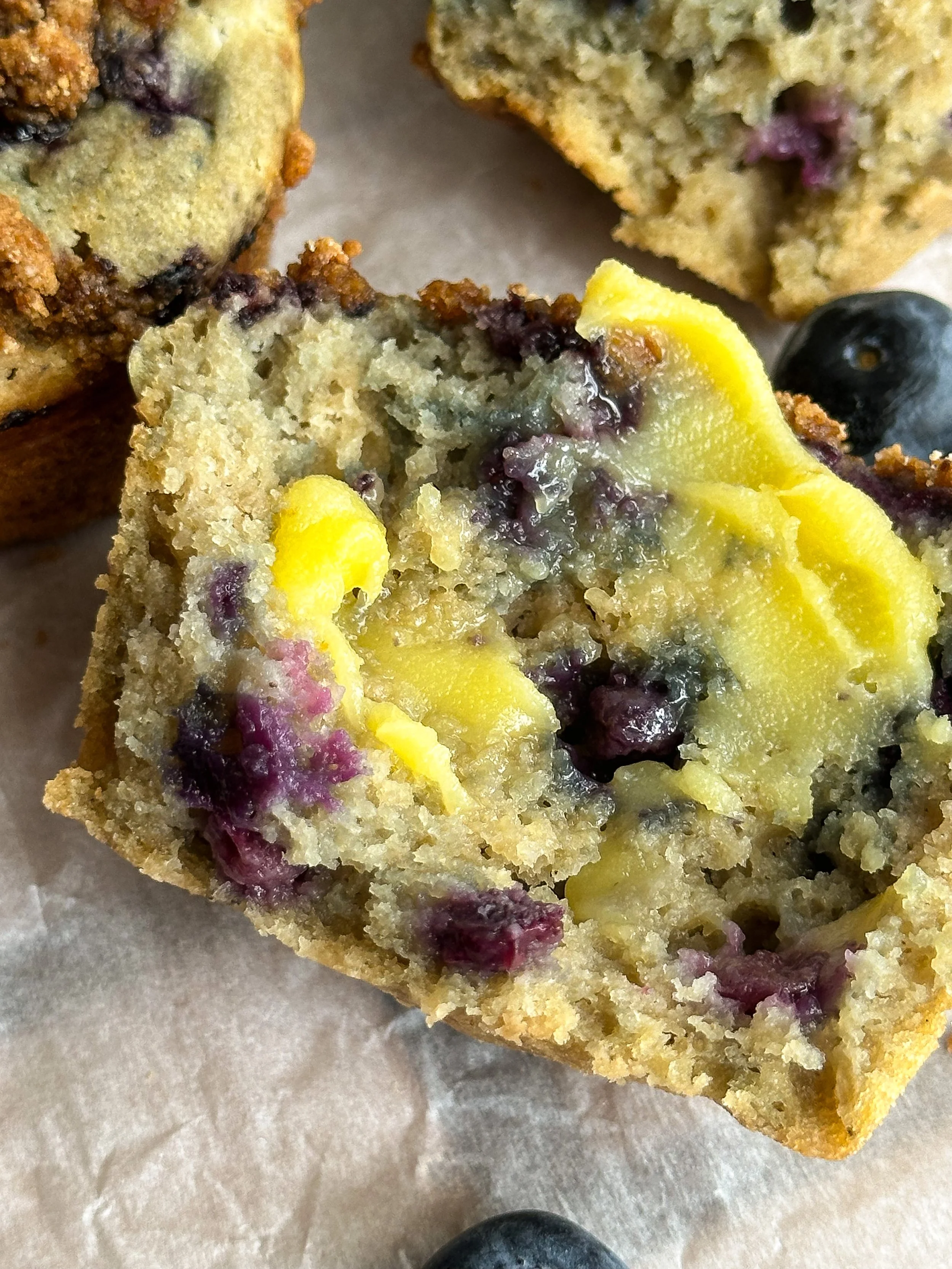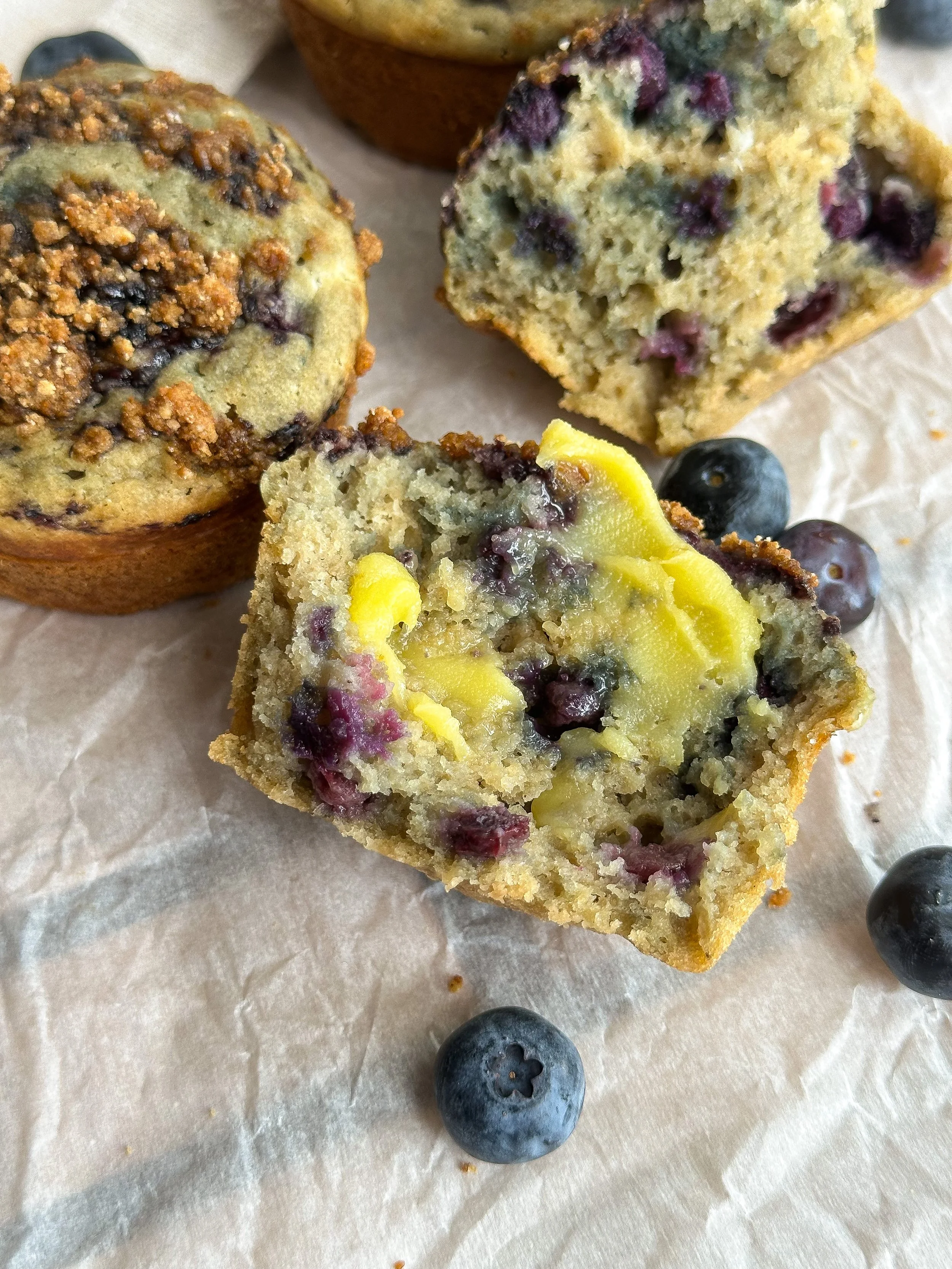 Soft, fluffy vanilla blueberry muffins swirled with jam and topped with a golden crumble. Gluten-free, dairy-free, and naturally sweetened.